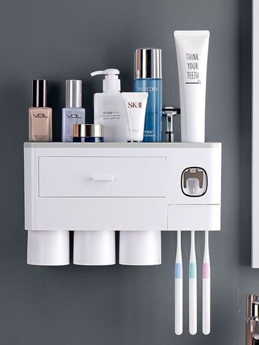 В нем есть абсолютно все для большой семьи. А именно: 4 стакана для полоскания полости рта, 2 дозатора для зубной пасты, 5 держателей для зубных щеток (подойдут как взрослые, так и детские), дополнительная полка для аксессуаров.